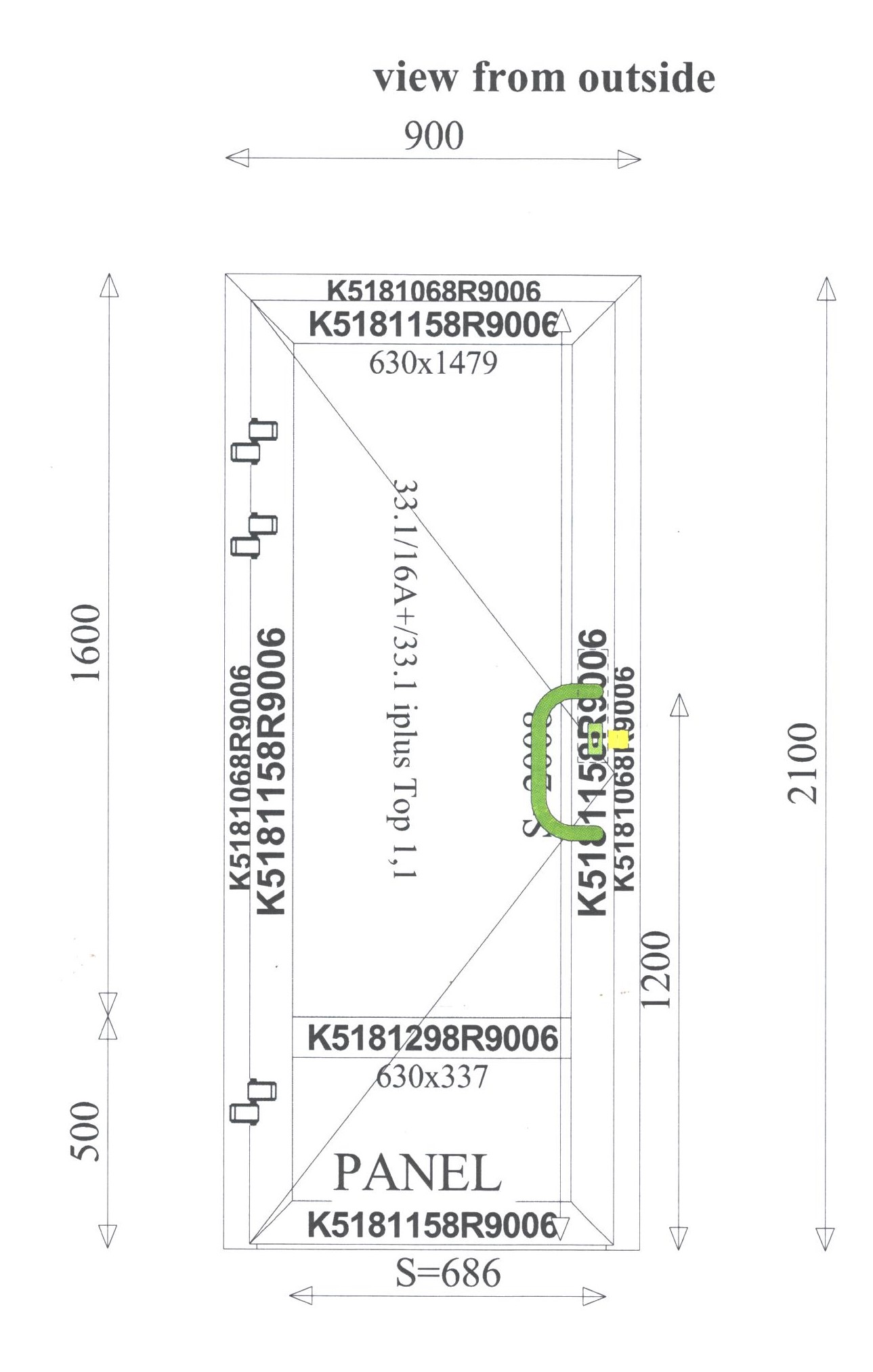 Dies ist ein Beispiel für eine Zeichnung einer Tür mit allen Abmessungen. Sie sollte auch das Material und die Farbe innen und außen zeigen. Die Tür ist vom Aussen des Gebäudes aus gesehen und öffnet sich von links nach Aussen. Diese Zeichnung kann von Designern oder Architekten mit den entsprechenden Computerprogrammen erstellt werden. Die Zeichnung kann die genaue Größe und Position des Glaspakets usw. zeigen. Bei der Bestellung bitte unbedingt der empfohlene Wärmedurchgangskoeffizient angeben werden, z. B. Wert von ca. 0,8 bis 1,2 W/(m²K).
