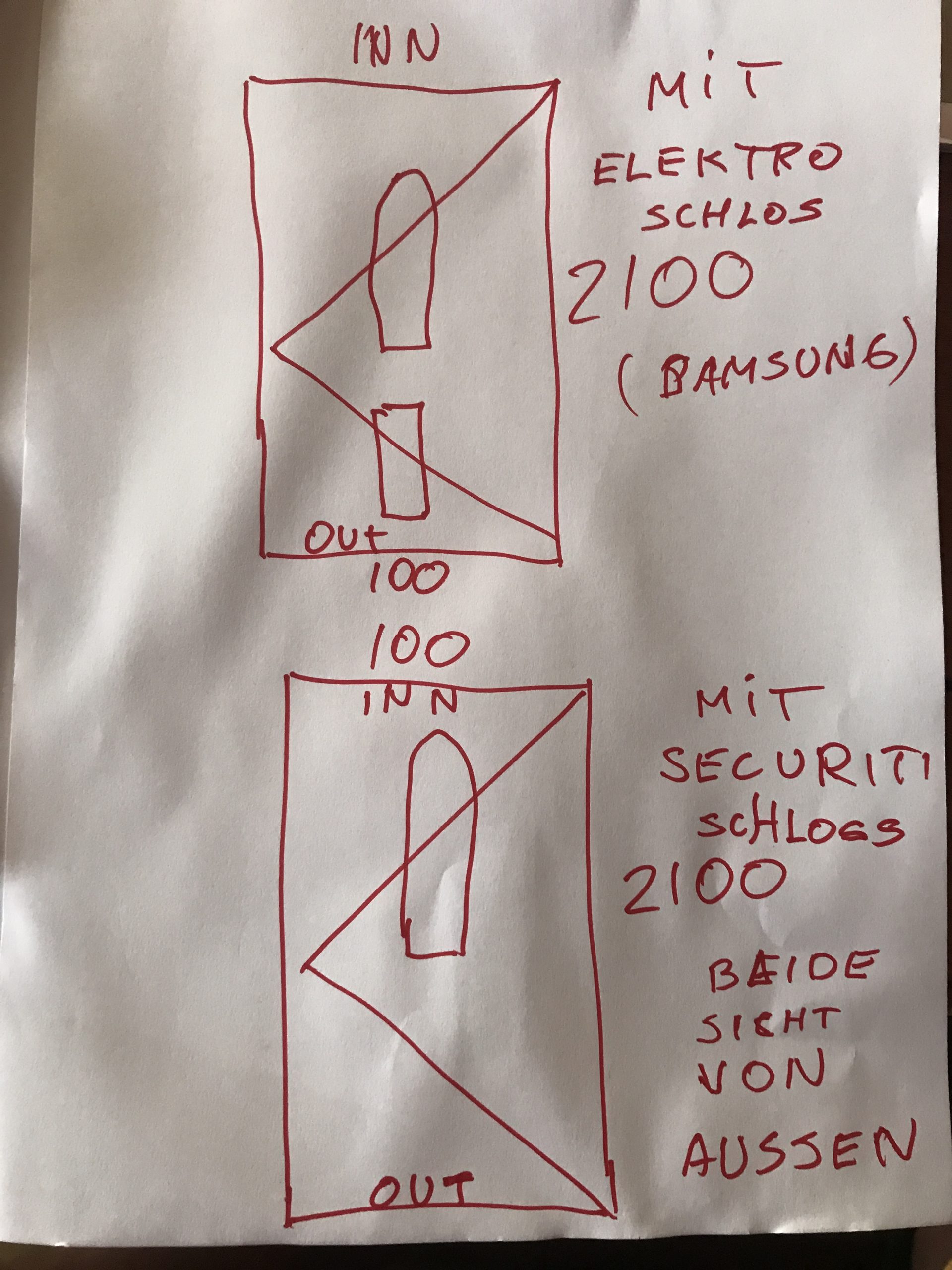 Hier ist eine handgezeichnete Zeichnung der beiden Türen mit Abmessungen und der Position der Fenster. Diese Zeichnung ist auch für ein Angebot geeignet. An beiden Türen sind die Position und die Form der Fenster dargestellt. und die Öffnungsseite der Tür, sowie die Ansicht von innen oder außen.